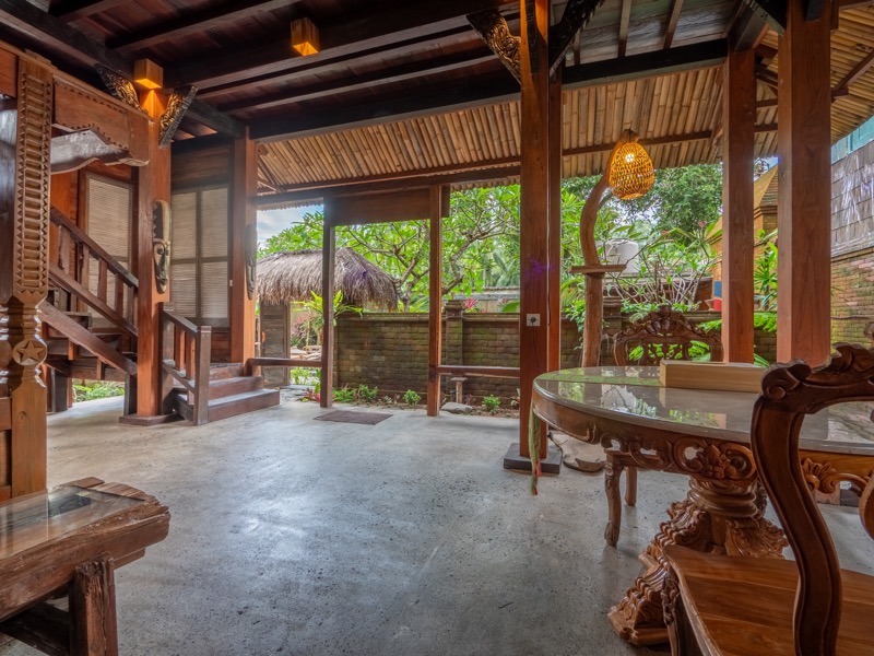 Downstairs, a peaceful open-air space invites you to unwind, with a simple table for enjoying fresh tropical breakfasts and a comfortable lounging area ideal for quiet afternoons amidst the sounds of nature. Every detail at Asmara Loka reflects the beauty of island living, offering an intimate retreat where simplicity meets soulful tranquility.