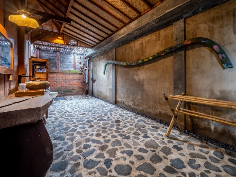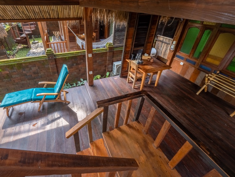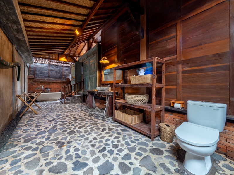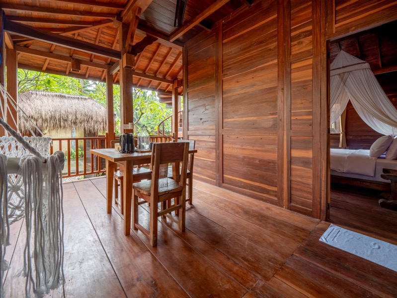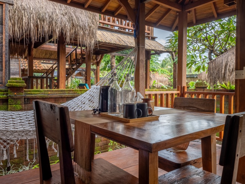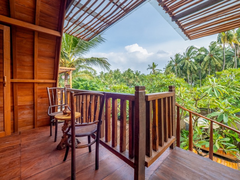 The upper bedroom offers a peaceful space to unwind, with soft linens and sweeping views of the surrounding greenery, while the ground floor bedroom provides a cozy, restful atmosphere with easy access to the villa’s tranquil outdoor spaces. A shaded open-air lounge invites you to savor quiet mornings, leisurely meals, and relaxing afternoons in perfect harmony with the island’s natural rhythms. At Saujana, every moment is an invitation to slow down, breathe deeply, and reconnect with nature.