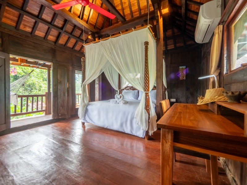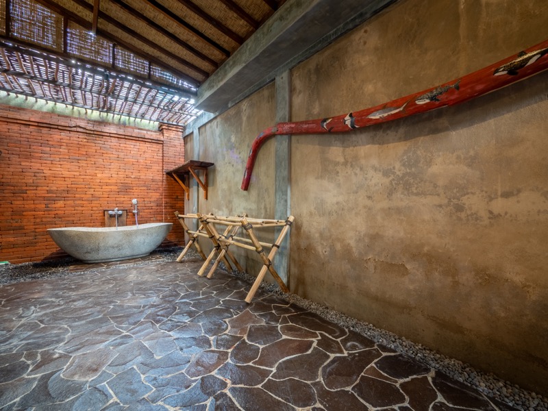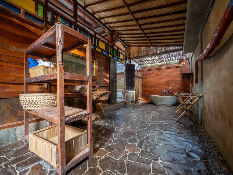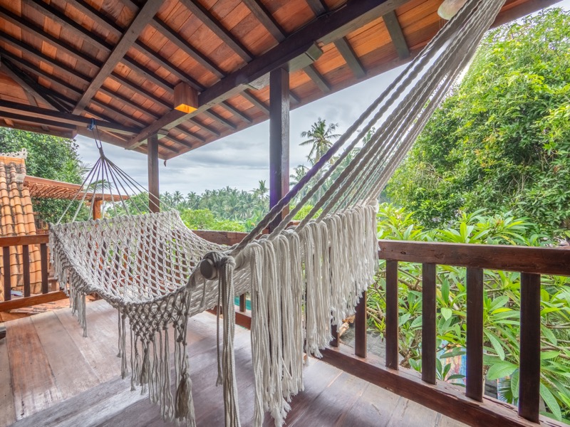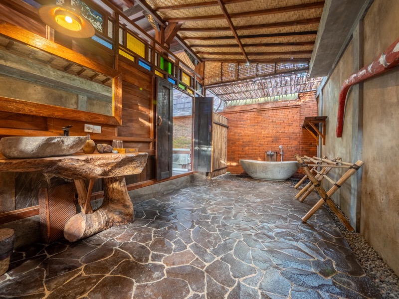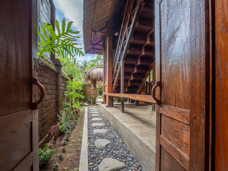 Downstairs, a peaceful open-air space invites you to unwind, with a simple table for enjoying fresh tropical breakfasts and a comfortable lounging area ideal for quiet afternoons amidst the sounds of nature. Every detail at Asmara Loka reflects the beauty of island living, offering an intimate retreat where simplicity meets soulful tranquility.