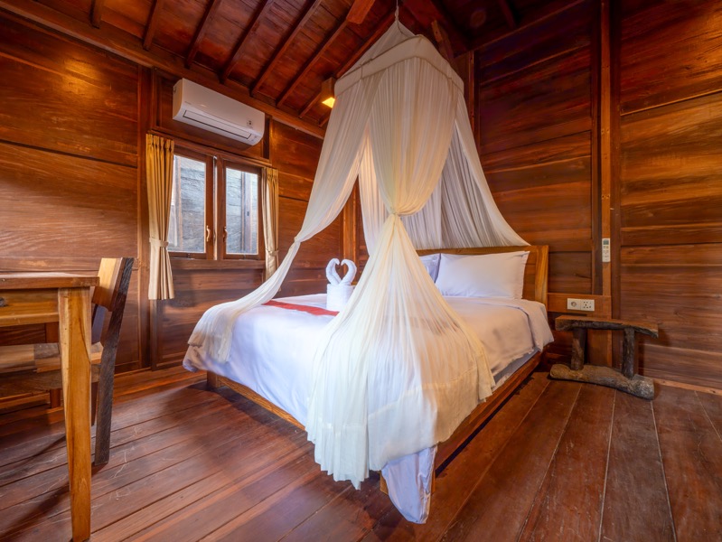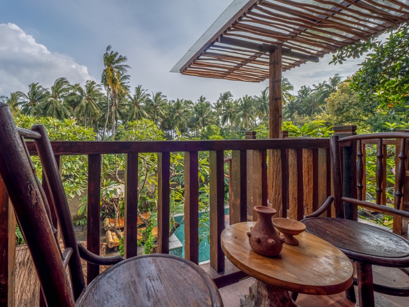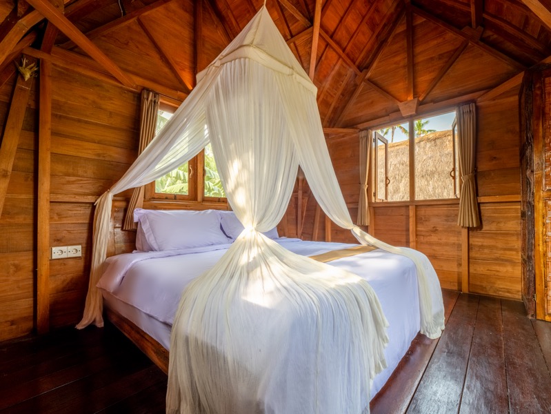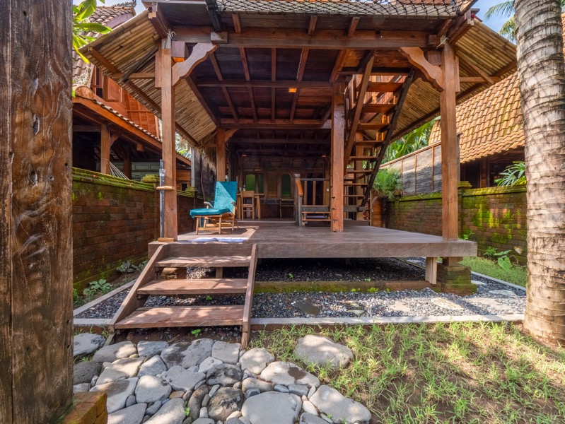 The upper bedroom offers a peaceful space to unwind, with soft linens and sweeping views of the surrounding greenery, while the ground floor bedroom provides a cozy, restful atmosphere with easy access to the villa’s tranquil outdoor spaces. A shaded open-air lounge invites you to savor quiet mornings, leisurely meals, and relaxing afternoons in perfect harmony with the island’s natural rhythms. At Saujana, every moment is an invitation to slow down, breathe deeply, and reconnect with nature.