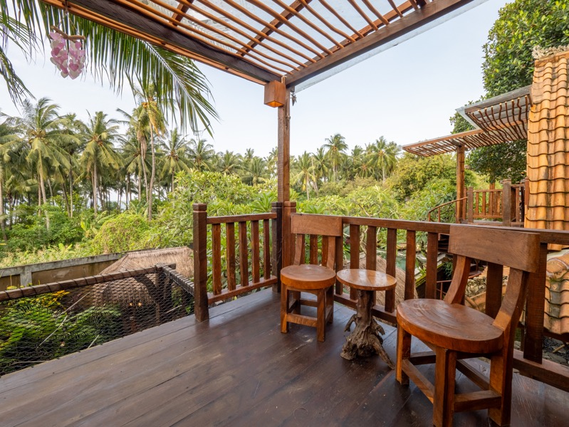 Below, a charming open-air lounge space invites you to relax, read, or enjoy a slow, sun-drenched morning with a cup of coffee. Embracing simplicity and warmth, Swastamika is a perfect retreat for couples or solo travelers looking to reconnect with nature in a peaceful, intimate setting.